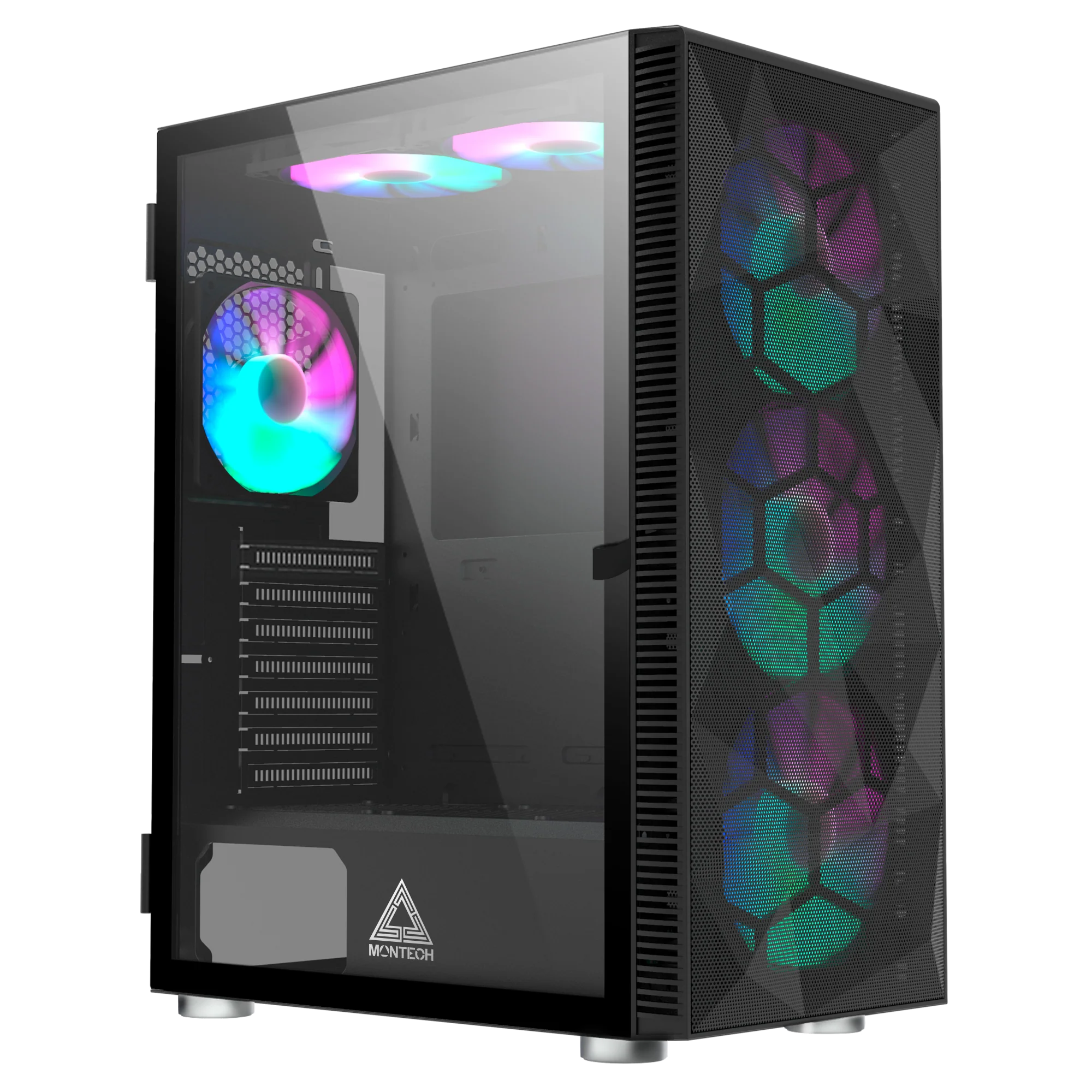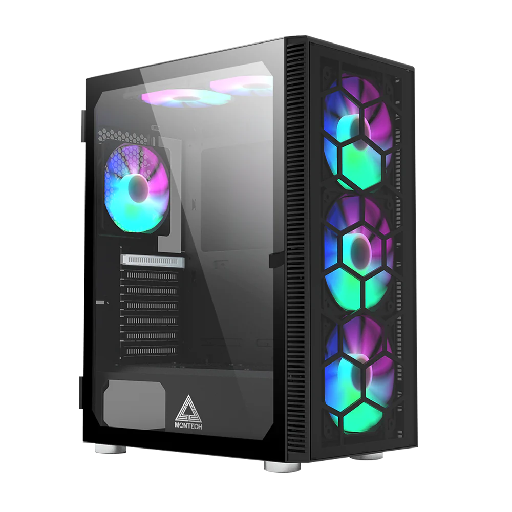Montech X3 Mesh Black – 3x 140 mm statische RGB-Lüfter + 3x 120 mm statische RGB-Lüfter. seitlich schwenkbares gehärtetes Glas