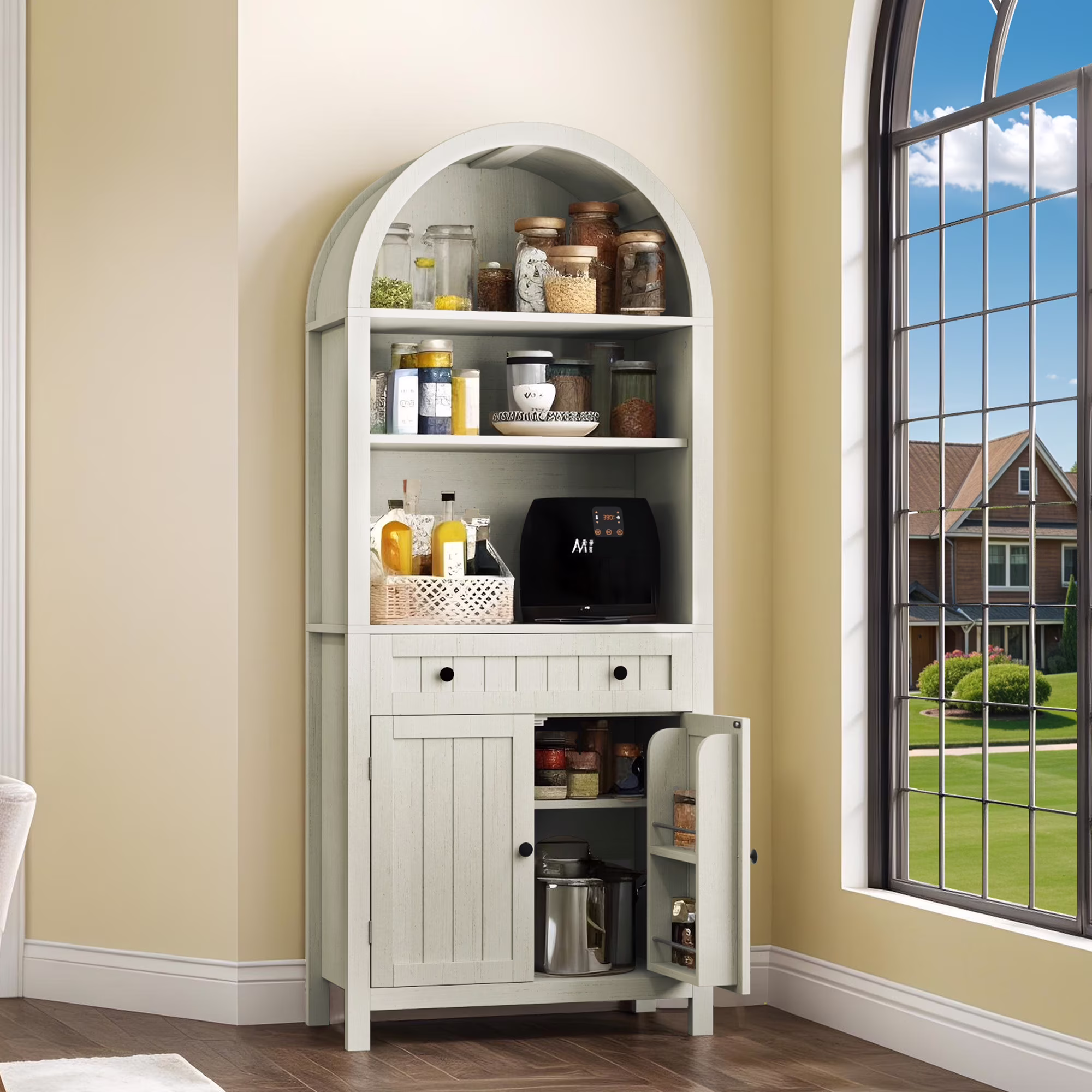ModFusion 73-Inch Tall Rounded Arch Pantry Cabinet with Charging Station, Drawer, Spice Racks, Farmhouse Buffet, Microwave Stand, Brown Oak Wood