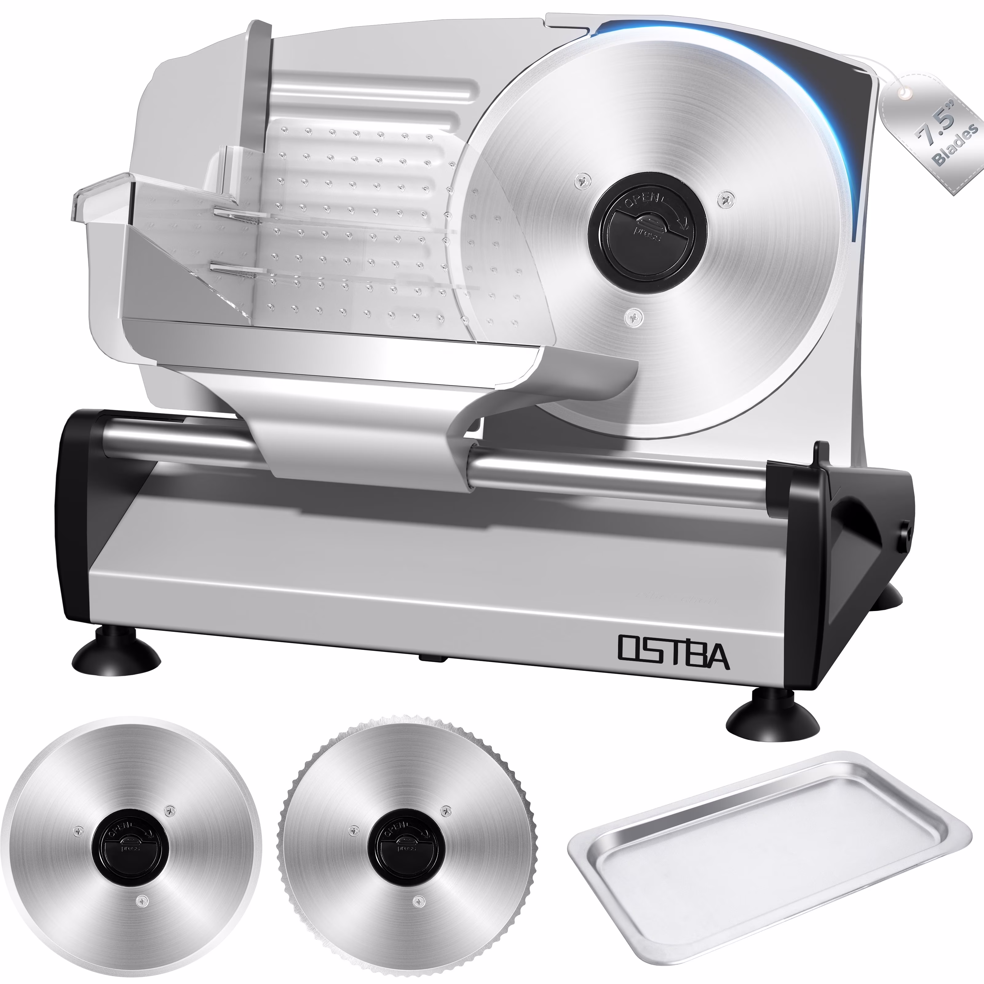 OSTBA Meat Slicer with Quiet DC Motor, 200W Electric Deli Slicer, Dual 7.5'' Stainless Steel Blades, 0-15mm Adjustable Thickness, Easy to Clean, Ideal for Meat, Cheese, Bread, and Vegetables