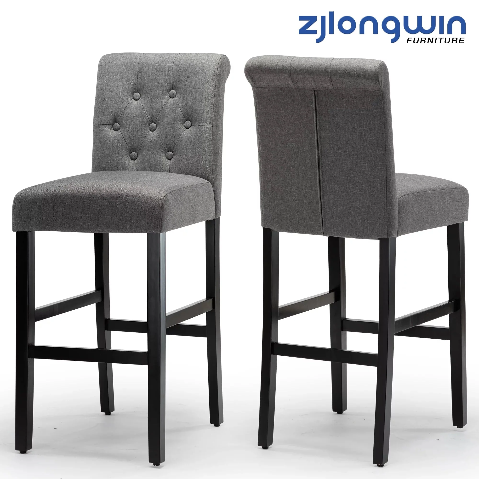 Bar Height Full Back Button Tufted Fabric Upholstered Bar Stool, Gray, Set of 2