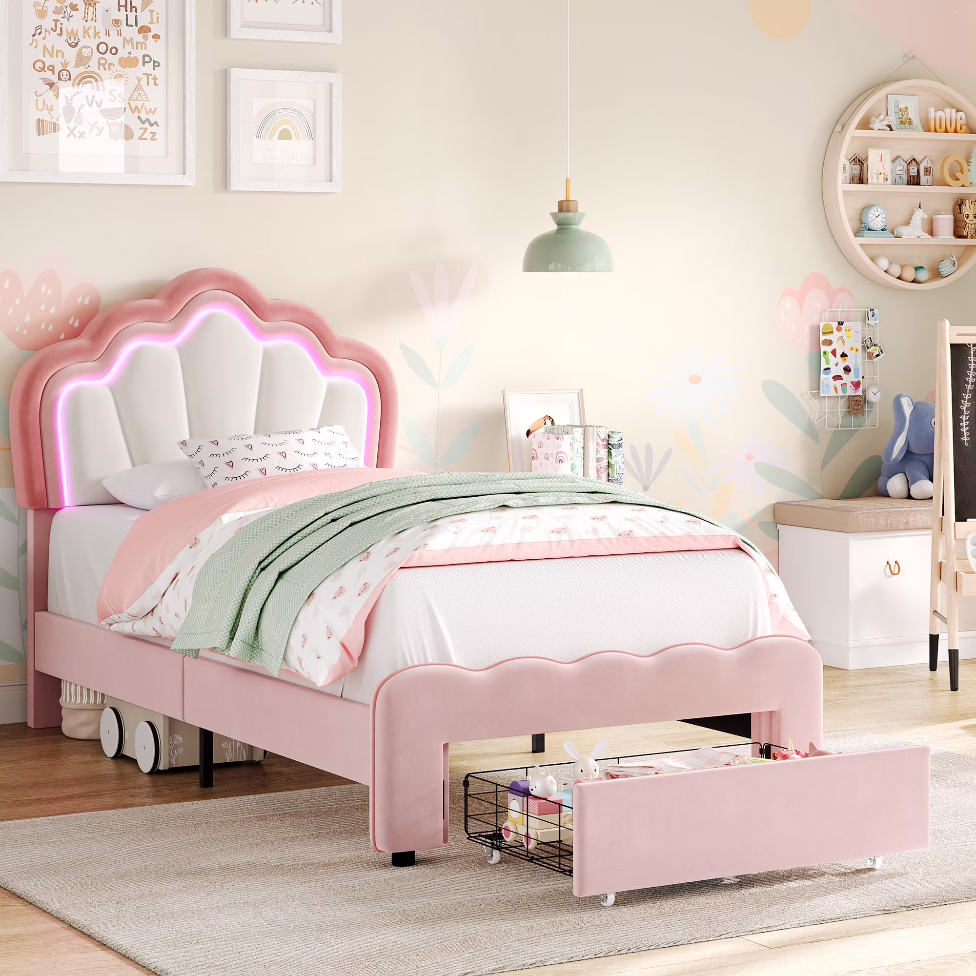 Homfa Twin Size LED Bed Frame with Storage Drawer, Velvet Upholstered Platform Bed with Adjustable Petal Headboard, Pink