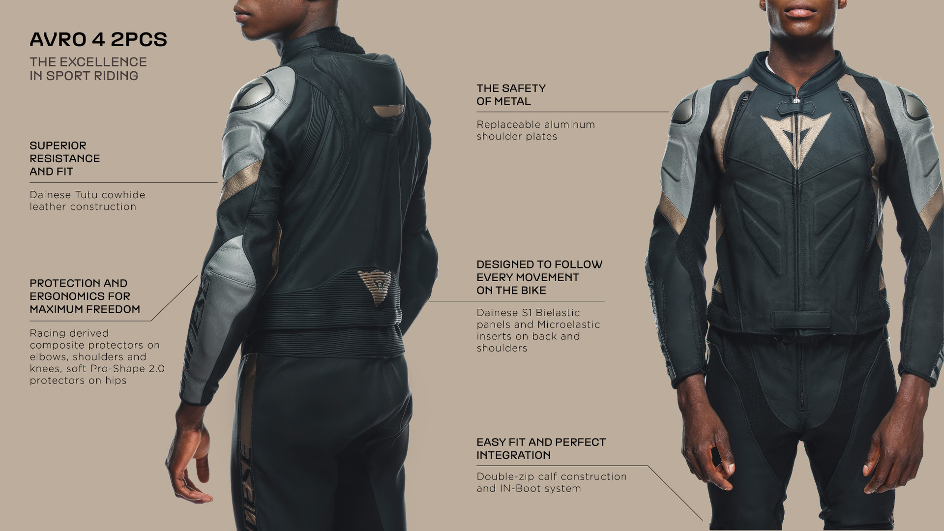 Dainese Avro 4 two-piece motorcycle suit made with premium Tutu cowhide. consisting of a motorcycle jacket and pants joined by a comfortable and resistant zipper that runs around the waist. Optimized for road riding. suitable for any type of route.