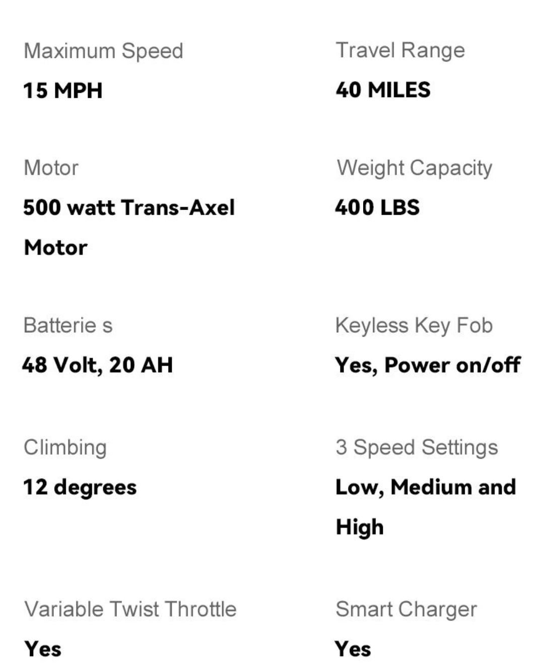 This is a beautiful machine. Lots of great features similar to what you find in a car. Easy to learn and operate. Having ridden ATVs for years, this was very similar to an ATV to operate. I live in a 55 and older mobile home park and have cruised through the park using mostly 1st gear. It has 3 gears. I have received compliments accompanied by OOh's and Ah's from everyone who sees it. Beautiful candy apple red color. Good suspension going over the speed bumps. Comfortable seat. Arm rests fold up for ease of access to seat. One negative: Suspension is pretty stiff, even with minimum air pressure in tires.