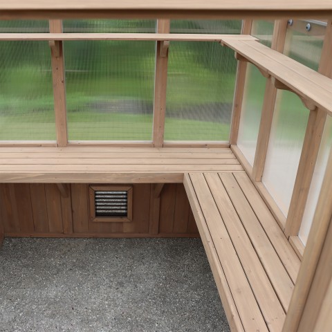 Tongue and groove style 32 high cedar base walls add a premium aesthetic and allows for storage of gardening tools that are out of sight from the exterior. The walls also provide protection from rock-shooting lawn mowers. Louvered base wall vent that is necessary for optimum air intake and plant health.